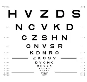 The LogMAR chart is designed to enable more accurate estimates of acuity as compared to other acuity charts (e.g., the Snellen chart).[1] Each line of the LogMAR chart comprises the same number of test letters (effectively standardizing the test across letter size); the letter size change from one line to the next is a constant ratio, as is the spacing between lines (making the chart easy to use at nonstandard viewing distances). In ETDRS charts, the Sloan letters are used (Sloan letters are perfectly square approximately equally legible one from another), while the Bailey–Lovie chart used rectangular (5:4) letters based on the Transport typeface, as set out in British Standard 4274:1968.[1]