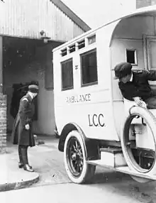 Although the MAB was legally supposed to be transporting only infectious patients, it increasingly also carried accident victims and emergency medical cases. The Metropolitan Ambulances Act 1909 empowered the London County Council to establish an emergency ambulance service, but this was not established until February 1915 and was under the control of the chief of the London Fire Brigade.[7] Also in 1915, the MAB Ambulance Section were the first public body to employ women drivers, due to the number of men who had volunteered for military service. By July 1916, the London County Council Ambulance Corps was staffed entirely by women.[8]