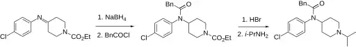 The starting material is the imine formed by combining 4-chloroaniline and N-carbethoxy-4-piperidone, which is reduced with sodium borohydride and then acylated with the acid chloride of phenylacetic acid to produce an amide. Selective hydrolysis with hydrobromic acid, followed by alkylation with isopropyl bromide gives lorcainide.[10][11]