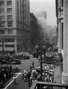 By 1900, the department had grown to 18 fire stations with 123 full-time paid firefighters and 80 fire horses.[12] The city had also installed 194 fire-alarm boxes allowing civilians to sound the alarm if a fire was spotted. 660 fire hydrants were placed throughout the city, giving firefighters access to a reliable water source.[13] In 1955 Station 78 in Studio City became the first racially integrated station in the department.[14]