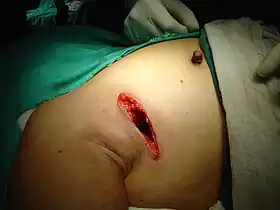 Lumpectomy (sometimes known as a tylectomy, partial mastectomy, breast segmental resection or breast wide local excision) is a surgical removal of a discrete portion or "lump" of breast tissue, usually in the treatment of a malignant tumor or breast cancer.[1] It is considered a viable breast conservation therapy, as the amount of tissue removed is limited compared to a full-breast mastectomy, and thus may have physical and emotional advantages over more disfiguring treatment. Sometimes a lumpectomy may be used to either confirm or rule out that cancer has actually been detected. A lumpectomy is usually recommended to patients whose cancer has been detected early and who do not have enlarged tumors. Although a lumpectomy is used to allow for most of the breast to remain intact, the procedure may result in adverse affects that can include sensitivity and result in scar tissue, pain, and possible disfiguration of the breast if the lump taken out is significant.[2] According to National Comprehensive Cancer Network guidelines, lumpectomy may be performed for ductal carcinoma in situ (DCIS), invasive ductal carcinoma, or other conditions.[3]
