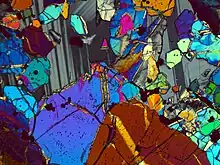 Lunar regolith is composed of various types of particles including rock fragments, mono-mineralic fragments, and various kinds of glasses including agglutinate particles, volcanic and impact spherules.[15] The agglutinates form at the lunar surface by micrometeorite impacts that cause small-scale melting which fuses adjacent materials together with tiny specks of elemental iron embedded in each dust particle's glassy shell.[16]