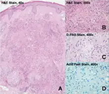 - ↑ Wang SH, Tsai TF (2007). "Several Erythematous Papules with a 1.5-cm Sized Nodule Scattering on the Face of an Old Woman". Dermatol Sinica. 25 (2): 175-6.