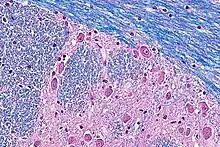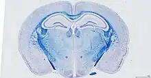 Luxol fast blue stain, abbreviated LFB stain or simply LFB, is a commonly used stain to observe myelin under light microscopy, first developed by Heinrich Klüver and Elizabeth Barrera in 1953.[1] Luxol fast blue refers to one of a group of three chemically and histologically similar dyes. LFB is commonly used to detect demyelination in the central nervous system (CNS), but cannot well discern myelination in the peripheral nervous system.[2][3]