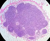 The lymph nodes, the spleen and Peyer's patches, together are known as secondary lymphoid organs. Lymph nodes are found between lymphatic ducts and blood vessels. Afferent lymphatic vessels bring lymph fluid from the peripheral tissues to the lymph nodes.[4] The lymph tissue in the lymph nodes consists of immune cells (95%), for example lymphocytes, and stromal cells (1% to 5%)[5] The genesis of lymph nodes begins within the blood and the lymphatic system.[4] Interactions between stromal and hematopoietic cells are important for the development of lymph nodes. Crosstalk LEC, lymphoid tissue inducer cells and mesenchymal stromal organizer cells initiate the formation of lymph nodes.[1]