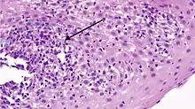 | Pathology image of lymphocytic esophagitis (H&E stain). The image demonstrates common findings in the condition: dense peripapillary lymphocytic infiltrate with spongiosis (arrow), and absence of neutrophils and eosinophils. | |