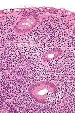 It may refer to a benign lymphoepithelial lesion of the parotid gland or benign lymphoepithelial lesion of the lacrimal gland, or may refer to the infiltration of malignant lymphoid cells into epithelium, in the context of primary gastrointestinal lymphoma.[1]