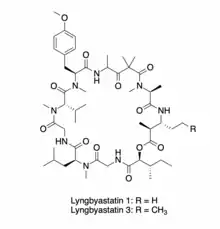 - 1 2 Dhakal, Dipesh; Kokkaliari, Sofia; Rubin, Garret M.; Paul, Valerie J.; Ding, Yousong; Luesch, Hendrik (2023-01-27). "Biosynthesis of Lyngbyastatins 1 and 3, Cytotoxic Depsipeptides from an Okeania sp. Marine Cyanobacterium". Journal of Natural Products. 86 (1): 85–93. doi:10.1021/acs.jnatprod.2c00782. ISSN 0163-3864. PMC 10197921. PMID 36546857.