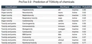 - ↑ Banerjee P, Kemmler E, Dunkel M, Preissner R (July 2024). "ProTox 3.0: a webserver for the prediction of toxicity of chemicals". Nucleic Acids Research. 52 (W1): W513 – W520. doi:10.1093/nar/gkae303. PMC 11223834. PMID 38647086.