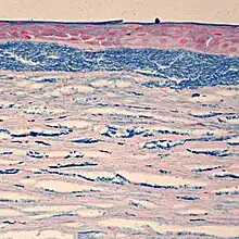 | Colloidal iron staining shows deposition of glycosaminoglycans in the cornea | |