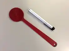 The Maddox rod test can be used to subjectively detect and measure a latent, manifest, horizontal or vertical strabismus for near and distance. The test is based on the principle of diplopic projection.[1] Dissociation of the deviation is brought about by presenting a red line image to one eye and a white light to the other, while prisms are used to superimpose these and effectively measure the angle of deviation (horizontal and vertical). The strength of the prism is increased until the streak of the light passes through the centre of the prism, as the strength of the prism indicates the amount of deviation present. The Maddox rod is a handheld instrument composed of red parallel plano convex cylinder lens, which refracts light rays so that a point source of light is seen as a line or streak of light.[2] Due to the optical properties, the streak of light is seen perpendicular to the axis of the cylinder.[3]