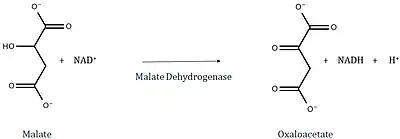 Malate dehydrogenases catalyzes the interconversion of malate to oxaloacetate. In the citric acid cycle, malate dehydrogenase is responsible for catalyzing the regeneration of oxaloacetate This reaction occurs through the oxidation of hydroxyl group on malate and reduction of NAD+. The mechanism of the transfer of the hydride ion to NAD+ is carried out in a similar mechanism seen in lactate dehydrogenase and alcohol dehydrogenase. The ΔG'° of malate dehydrogenase is +29.7 kJ/mol and the ΔG (in the cell) is 0 kJ/mol.[11]