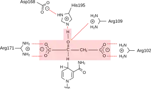 The active site of malate dehydrogenase is a hydrophobic cavity within the protein complex that has specific binding sites for the substrate and its coenzyme, NAD+. In its active state, MDH undergoes a conformational change that encloses the substrate to minimize solvent exposure and to position key residues in closer proximity to the substrate.[6] The three residues in particular that comprise a catalytic triad are histidine (His-195), aspartate (Asp-168), both of which work together as a proton transfer system, and arginines (Arg-102, Arg-109, Arg-171), which secure the substrate.[10]