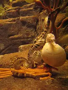 The fish family Syngnathidae has the unique characteristic of a highly derived form of male brood care referred to as "male pregnancy".[2] The family is highly diverse, containing around 300 different species of fish. Included in Syngnathidae are seahorses, the pipefish, and the weedy and leafy seadragons. The males of some of these species possess a brood pouch on the trunk or tail; in other species, the eggs are merely attached to the male's trunk or tail when the female lays them. Although biologists' definitions of pregnancy somewhat differ, all members of the family are considered by ichthyologists to display male pregnancy, even those without an external brood pouch.