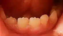 A mamelon (from French mamelon, "nipple") is one of three rounded protuberances which are present on the cutting edge of an incisor tooth when it first erupts through the gum. Mamelons' appearance can be smoothed by a dentist if they have not been worn down naturally by biting and eating foods.[1] Mamelons are present on permanent central and lateral incisors. Mamelons are easiest to observe on the maxillary central incisors, and appear as three small prominences on the incisal edge of the tooth.[2] Mamelons are ordinarily of no clinical importance.[3] Usually, they are worn off early in the life of the tooth.