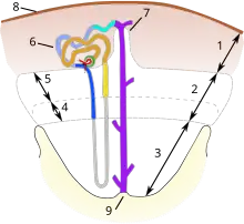 Structurally, the cortex consists of cortical labyrinth and medullary rays.[9] The cortical labyrinth contains interlobular arteries, vascular networks formed by afferent and efferent arterioles, renal corpuscles, proximal convoluted tubules, macula densa, distal convoluted tubules, connecting tubules and the initial parts of the collecting ducts.[72] The proximal convoluted tubules predominate in the cortical labyrinth.[73] The continuous layer of the cortex lying above the medullary rays is called the cortex corticis.[9] Cortex corticis differs from the rest of the cortical labyrinth in that it doesn't contain glomeruli.[74][75] Some mammals (for example, pig) have nephrons whose loops of Henle do not reach the medulla; such nephrons are called cortical nephrons.[68][76] Cortical nephrons have a very short thin segment of the loop of Henle, and this segment may even be absent.[76] The medullary rays of the cortex contain the proximal straight tubules, the cortical part of the thick ascending limb of the loops of Henle, and the cortical part of the collecting ducts.[72] The cortex is divided into lobules, each of which is a medullary ray in conjunction with connected to it nephrons, and interlobular arteries that pass between the lobules.[77]