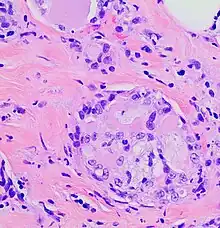 In 1980, Tavaosoli and Norris renamed juvenile breast carcinoma as "secretory carcinoma of the breast" based on its characteristic microscopic appearance[7] of having eosinophilic (i.e. red or pink) extracellular secretions when its tissues were stained with the H&E stain.[8] MSC has sometimes been termed secretory carcinoma without reference to its breast cancer location. However, the term secretory carcinoma has also been used to name tumors with the microscopic appearance of MSC that are localized in the salivary glands (now termed mammary analogue secretory carcinoma),[9] thyroid gland (now termed salivary gland–type carcinoma of the thyroid),[10] or skin (now termed secretory carcinoma of the skin or primary cutaneous mammary analog secretory carcinoma).[11][12] Mammary secretory carcinoma is used here to distinguish it from these formerly termed secretory carcinomas.