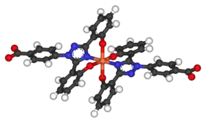 Deferasirox is an N-substituted bis-hydroxyphenyl-triazole. It is capable of removing iron from the blood through the coordination of two molecules of the deferasirox to a single iron ion, which forms the iron chelate (Fe-[deferasirox]2).[21] Each molecule of the tridentate chelator deferasirox binds to the iron at three sites, using one nitrogen atom and two oxygen atoms. This results in a stable octahedral geometry around the iron centre. The ability of deferasirox to remove iron stems directly from its relatively small size, which is what allows it to access the iron contained within the blood and inside tissues. Also, an important feature of deferasirox is that it has been shown to be highly selective for iron in the +3 oxidation state, and use of the drug does not lead to a significant decrease in the levels of other important metals in the body.[22]
