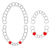 In the universal system of notation, the deciduous mandibular canines are designated by a letter written in uppercase. The right deciduous mandibular canine is known as "R", and the left one is known as "M". The international notation has a different system of notation. Thus, the right deciduous mandibular canine is known as "83", and the left one is known as "73".