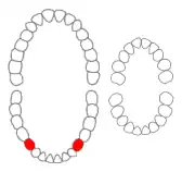 Mandibular first premolars of permanent teeth marked in red. There are no premolars in primary teeth.