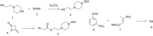 The alkylation between N-(2-hydroxyethyl)piperazine [103-76-4] (1) and Benzhydryl Bromide [776-74-9] (2) gives 2-(4-benzhydrylpiperazin-1-yl)ethanol [10527-64-7] (3). The reaction with Diketene [674-82-8] (4) gives 2-(4-benzhydryl-1-piperazinyl)ethyl acetoacetate [89226-49-3] (5). The reaction with 3-nitrobenzaldehyde [99-61-6] (6) and Methyl 3-aminocrotonate [14205-39-1] (7) completed the synthesis of Manidipine (8).