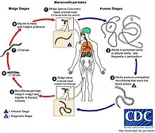 The third-stage larvae migrate to the midge's proboscis, where they can infect another human when the midge takes a blood meal.[5]
