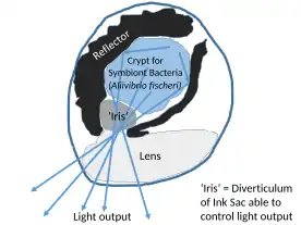 The symbiosis process begins when Peptidoglycan shed by the sea water bacteria comes in contact to the ciliated epithelial cells of the light organ. It induces mucus production in the cells. Mucus entraps bacterial cells. Antimicrobial peptides, nitric oxide and sialyted mucins in the mucus then selectively allow only V. fischeri which encode gene rscS to adhere and win over gram positive and other gram negative bacteria. The symbiotic bacteria are then guided up to the light organ via chemotaxis. After successful colonization, symbionts induce loss of mucus and ciliated sites to prevent further attachment of bacterial cells via MAMP (microbe associated molecular pattern) signalling. Also, they induce changes in protein expression in the host symbiotic tissues and modify both physiology and morphology of light organs. After bacterial cells divide and increase in population, they begin expressing enzyme luciferase as a result of quorum sensing. Luciferase enzymes produce bioluminescence.[12] Squids can then emit the luminescence from the light organ. Because Euprymna scolopes emerges only during night time, it helps them avoid predation. Bioluminescence allows them to camouflage with the light coming from moon and stars to ocean and avoid predators.[13]