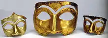 The word "mask" appeared in English in the 1530s, from Middle French masque "covering to hide or guard the face", derived in turn from Italian maschera, from Medieval Latin masca "mask, specter, nightmare".[1] This word is of uncertain origin, perhaps from Arabic maskharah مَسْخَرَۃٌ "buffoon", from the verb sakhira "to ridicule". However, it may also come from Provençal mascarar "to black (the face)" (or the related Catalan mascarar, Old French mascurer). This in turn is of uncertain origin – perhaps from a Germanic source akin to English "mesh", but perhaps from mask- "black", a borrowing from a pre-Indo-European language.[2] One German author claims the word "mask" is originally derived from the Spanish más que la cara (literally, "more than the face" or "added face"), which evolved to "máscara", while the Arabic "maskharat" – referring to the buffoonery which is possible only by disguising the face – would be based on these Spanish roots.[3] Other related forms are Hebrew masecha= "mask"; Arabic maskhara مَسْخَرَ = "he ridiculed, he mocked", masakha مَسَخَ = "he transfomed" (transitive).