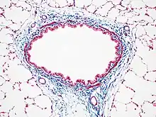 Another common variant is the Masson trichrome & Verhoeff stain, which combines the Masson trichrome stain and Verhoeff's stain.[2] This combination is useful for the examination of blood vessels; the Verhoeff stain highlights elastin (black) and allows one to easily differentiate small arteries (which typically have at least two elastic laminae) and veins (which have one elastic lamina).