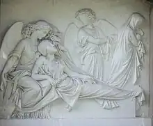 A mother dies and is taken by angels as her new child is taken away, a grave from 1863 in Striesener Friedhof in Dresden.