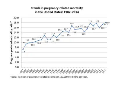 As of 2021, the US had an estimated 32.9 deaths per 100,000 births.[2] The CDC reported an increase in the maternal mortality ratio in the United States from 18.8 deaths per 100,000 births to 23.8 deaths per 100,000 births between 2000 and 2014, a 26.6% increase.[6] The mortality rate of pregnant and recently pregnant women in the United States rose almost 30% between 2019 and 2020.[7] According to the CDC, a study that included data from 36 states found that more than 80% of pregnancy-related deaths were preventable between 2017 and 2019.[8]