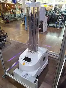 • Disinfection robot: It has the capability to disinfect a whole room in mere minutes, generally using pulsed ultraviolet light.[5][6] They are being used to fight Ebola virus disease.[7]