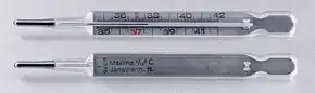 ![]() A medical/clinical mercury thermometer showing the temperature of 37.7 °C (99.9 °F) | |