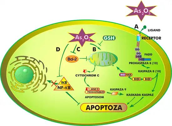 - ↑ Izdebska, Magdalena; Grzanka, Alina; Szczepański, Mariusz Andrzej; Litwiniec, Anna (9 September 2008). "Wybrane mechanizmy terapeutycznego oddziaływania trójtlenku arsenu w leczeniu nowotworów" [Selected mechanisms of the therapeutic effect of arsenic trioxide in cancer treatment]. Postepy Higieny I Medycyny Doswiadczalnej (Online) (in Polish). 62: 463–467. ISSN 1732-2693. PMID 18806735.