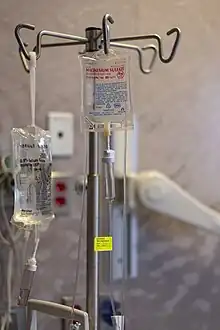 Magnesium sulfate as a medication is used to treat and prevent low blood magnesium and seizures in women with eclampsia.[1] It is also used in the treatment of torsades de pointes, severe asthma exacerbations, constipation, and barium poisoning.[1][2] It is given by injection into a vein or muscle as well as by mouth.[1][2] As epsom salts, it is also used for mineral baths.[3]