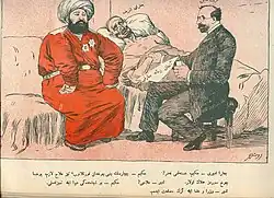 “Molla Nasraddin” – popular Azerbaijani magazine of that time, which was of great importance in medicine education, criticized such kinds of remains of the past, ridiculed backwardness of healers-evils of that time, their ignorant treatment of modern knowledge in medicine.[2] For instance, a caricature called “Holy Bukhara” (painted by Azim Azimzade) was given in the 20th issue of the magazine (1911).[13] Here the image of Bukhara emir, doubtfully treating recommendations of the doctor about a new medicine.