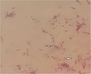 Melioidosis is caused by gram-negative, motile, saprophytic bacteria named Burkholderia pseudomallei.[14] The bacteria are usually opportunistic, facultative intracellular pathogens.[14] It is also aerobic and oxidase test positive.[2] A granule at the centre of the bacterium makes it resemble a "safety pin" when Gram stained.[2] The bacteria emit a strong soil smell after 24 to 48 hours of growth in culture, however smelling for the identification of the bacteria is not recommended for routine laboratory practice. One of the factors causing B. pseudomallei's resistance to various kinds of antibiotics is because it produces a glycocalyx polysaccharide capsule.[15] It is generally resistant to gentamicin and colistin but sensitive to co-amoxiclav. B. pseudomallei is a biosafety level 3 pathogen which requires specialized laboratory handling.[2] In humans and animals, another similar organism named Burkholderia mallei is the causative agent of the disease glanders.[1] B. pseudomallei can be differentiated from another closely related, but less pathogenic species B. thailandensis by its ability to assimilate arabinose.[10] B. pseudomallei is highly adaptable to various host environments ranging from inside mycorrhizal fungi spores to amoeba.[2] Its adaptability may give it a survival advantage in the human body.[1]