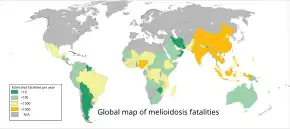 - ↑ Limmathurotsakul D, Golding N, Dance DA, Messina JP, Pigott DM, Moyes CL, Rolim DB, Bertherat E, Day NP, Peacock SJ, Hay SI (11 January 2016). "Predicted global distribution of Burkholderia pseudomallei and burden of melioidosis". Nature Microbiology. 1 (1): 15008. Bibcode:2016NatMb...115008L. doi:10.1038/nmicrobiol.2015.8. PMC 4746747. PMID 26877885.