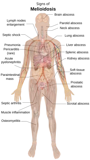 - ↑ Morse LP, Moller CC, Harvey E, Ward L, Cheng AC, Carson PJ, Currie BJ (August 2009). "Prostatic abscess due to Burkholderia pseudomallei: 81 cases from a 19-year prospective melioidosis study". The Journal of Urology. 182 (2): 542–7, discussion 547. doi:10.1016/j.juro.2009.04.010. PMID 19524969.