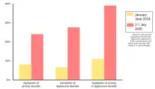 As the pandemic began, the risks were uncertain. As sick people flooded into hospitals and official advice evolved, the lack of information increased stress and anxiety.[25] Many uncertainties surrounded the beginning of the pandemic, including estimating infection risk, symptom overlap between COVID-19 and other health problems.[26] COVID-19 also caused many mental health problems. Patients experienced unfavorable psychological effects such as post-traumatic stress symptoms, disorientation, and rage when exposed to COVID-19.[27]