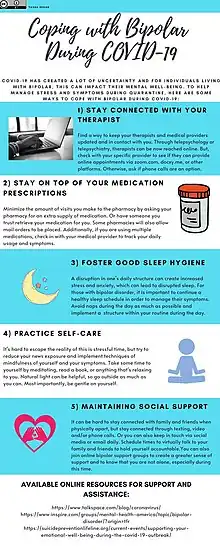WHO and CDC issued guidelines for minimizing mental health issues during the pandemic. The summarized guidelines are:[44][45][46]