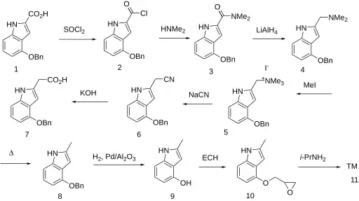 The first reported synthesis of mepindolol in 1971 used 4-hydroxy-2-methylindole {9) with epichlorohydrin and then isopropylamine to add the sidechain which was known to produce beta blockers, by analogy with drugs discovered by Imperial Chemical Industries, such as propanolol.[2] The requisite intermediate was synthesized in a multi-step procedure from 4-benzyloxyindole-2-carboxylic acid (1) which was converted into (9) by conventional chemistry.[3][4]