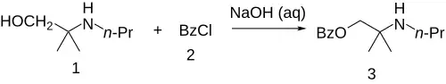 The 2-methyl-2-(propylamino)propan-1-ol [55968-10-0] (1) is treated with base and then with Benzoyl chloride (2), completing the synthesis of Meprycaine (3).