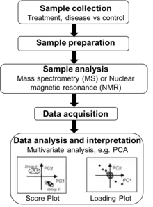 The typical workflow of metabolomics studies is shown in the figure. First, samples are collected from tissue, plasma, urine, saliva, cells, etc. Next, metabolites extracted often with the addition of internal standards and derivatization.[38] During sample analysis, metabolites are quantified (liquid chromatography or gas chromatography coupled with MS and/or NMR spectroscopy).[50] The raw output data can be used for metabolite feature extraction and further processed before statistical analysis (such as principal component analysis, PCA). Many bioinformatic tools and software are available to identify associations with disease states and outcomes, determine significant correlations, and characterize metabolic signatures with existing biological knowledge.[51]