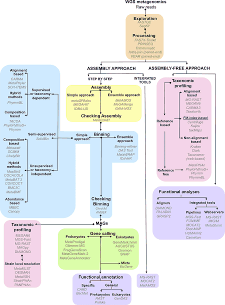 Schematic representation of the main steps necessary for the analysis of whole metagenome shotgun sequencing-derived data.[27] The software related to each step is shown in italics.