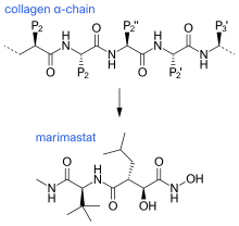 The first generation of MMP inhibitors were based on the structure of the collagen molecule. In the design of these inhibitors, the basic protein backbone of collagen is maintained but the amide bond is replaced with a zinc-binding group.[11] This group of inhibitors contain a hydroxamate (-CONHOH) group that binds the zinc atom in the active site of the MMP enzyme, therefore this group is called "hydroxamate-based MMP inhibitors“.[6] An example can be seen in Marimastat, a first generation inhibitor, which has a similar backbone and sidechain format to collagen.