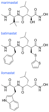 Ilomastat and batimastat were the first two MMP inhibitors to be tested in patients. These are both hydroxamate-based MMP inhibitors and have similar overall structures.