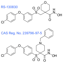 These inhibitors were followed by the next group of hydroxamate-based inhibitors, which focus on the suppression of metabolism, minimization of MMP-1 inhibitory activity and the control of subtype selectivity, by structure-based design. The tetrahydropyran in RS-130830 introduces a steric block that suppresses metabolism, which would fix the problem that the previous generation of inhibitors showed. The outcome of its clinical evaluation has not yet been disclosed. 239796-97-5 has improved ADME and MMP-1 selectivity properties and has shown excellent oral efficacy in an animal model of osteoarthritis. Although, the therapeutic objectives for these inhibitors is not cancer, like it has been for most of the MMP inhibitors.[7]