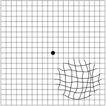 Metamorphopsia (from Ancient Greek: μεταμορφοψία, metamorphopsia, 'seeing mutated shapes') is a type of distorted vision in which a grid of straight lines appears wavy or partially blank. In addition, metamorphopsia can result in misperceptions of an object's size, shape,[3] or distance to the viewer. People can first notice they suffer from the condition when looking at mini blinds in their home.