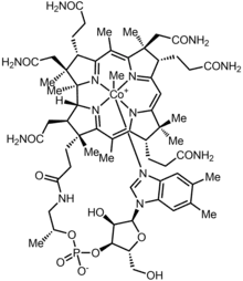 Methylcobalamin (mecobalamin, MeCbl, or MeB12) is a cobalamin, a form of vitamin B12. It differs from cyanocobalamin in that the cyano group at the cobalt is replaced with a methyl group.[1] Methylcobalamin features an octahedral cobalt(III) centre and can be obtained as bright red crystals.[2] From the perspective of coordination chemistry, methylcobalamin is notable as a rare example of a compound that contains metal–alkyl bonds. Nickel–methyl intermediates have been proposed for the final step of methanogenesis.